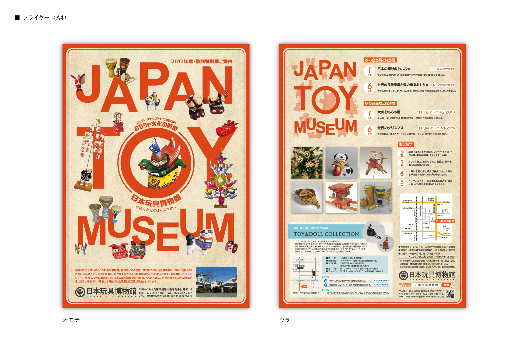 「日本玩具博物館」の通年フライヤー、特別展のフライヤーなどのデザインを担当。通年版については「資料の豊富さ・学びの楽しさ」を意識して制作。特別展は「春夏・秋冬」の2パターンの展開ということで、色やイメージをそれぞれの季節に合わせた。